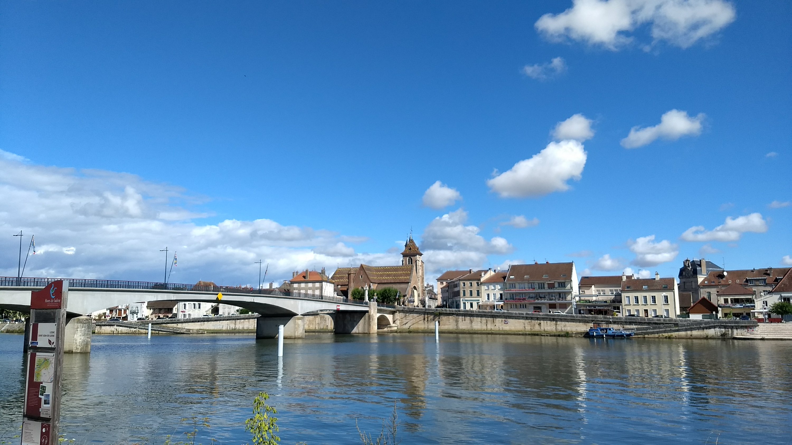Nous déjeûnons à Saint-Jean-de-Losne, toute petite ville (la plus petite de France paraît-il), près de canards et d’une mamie sur le perron de sa maison.