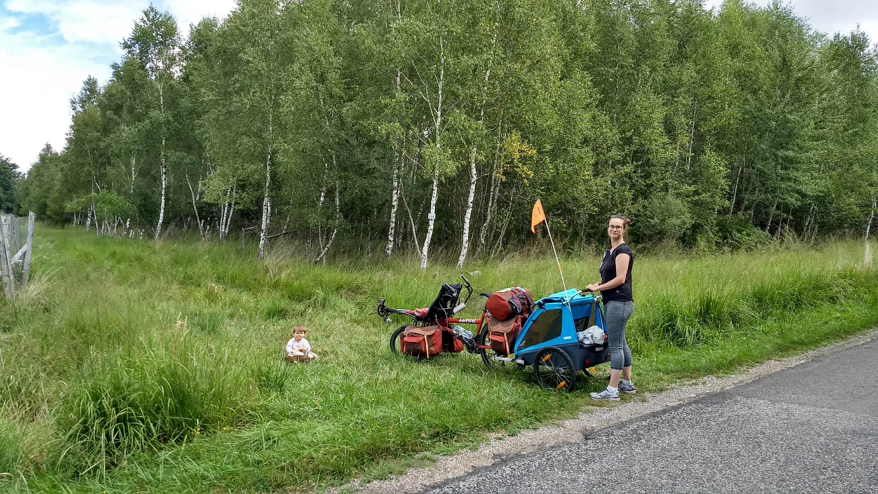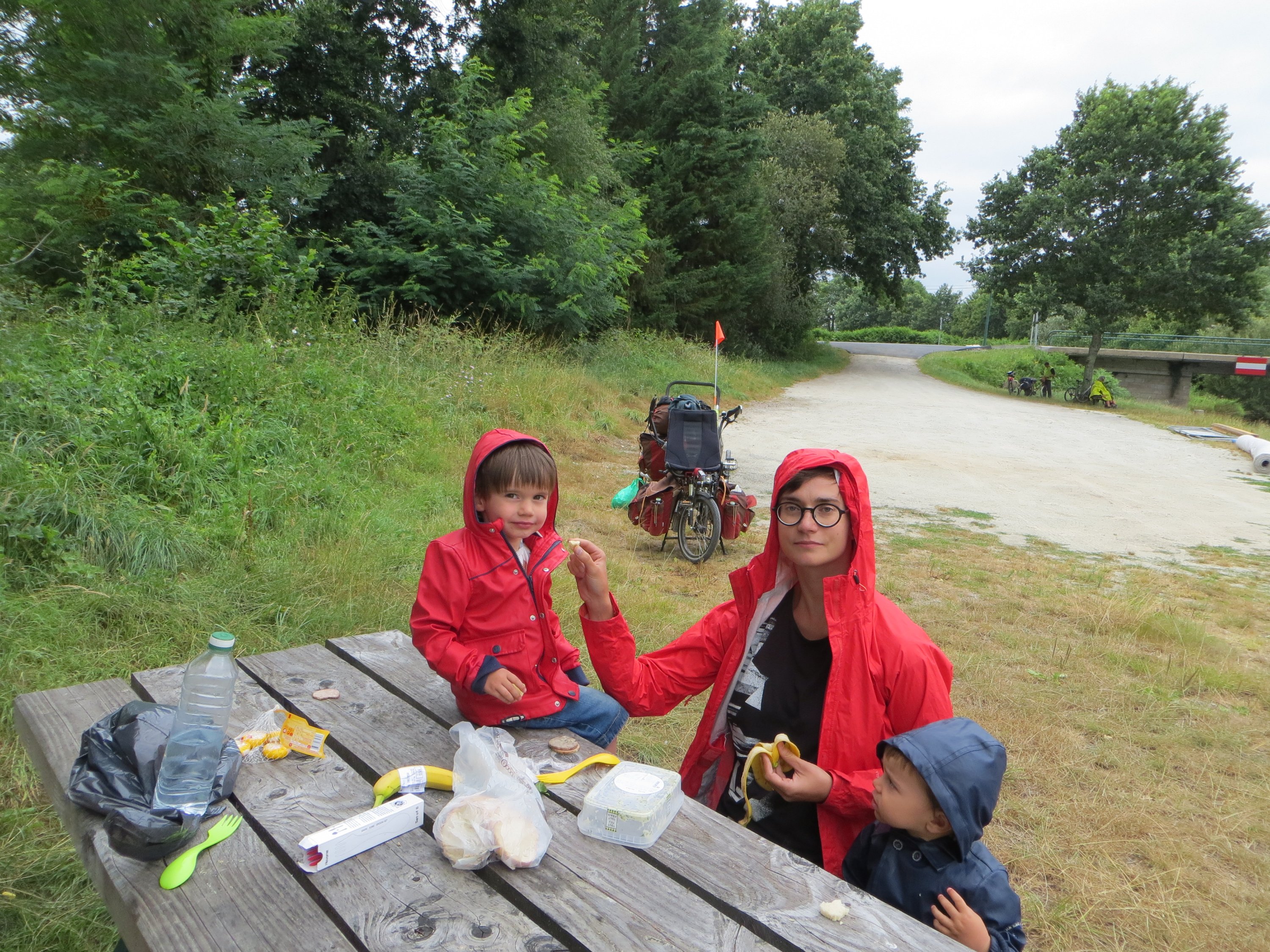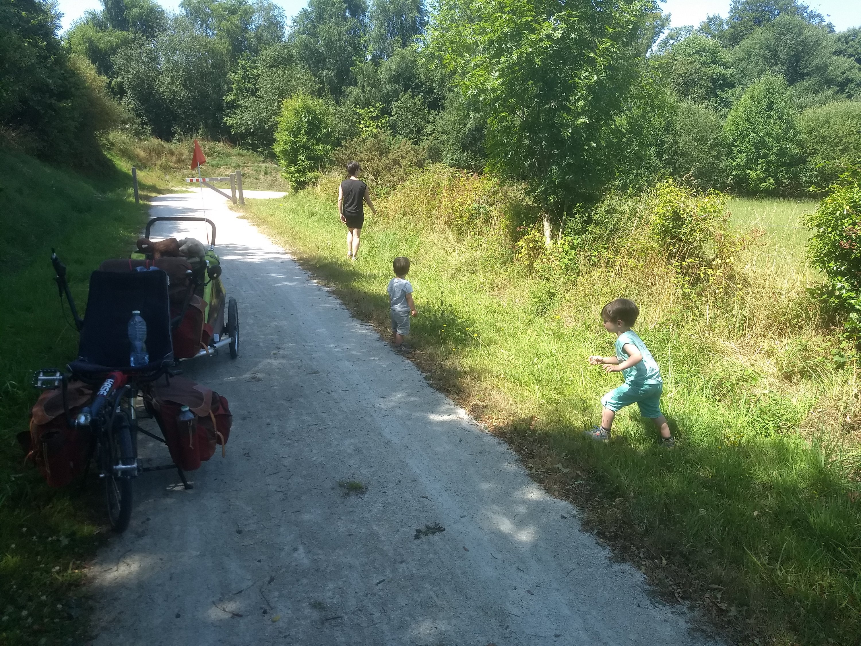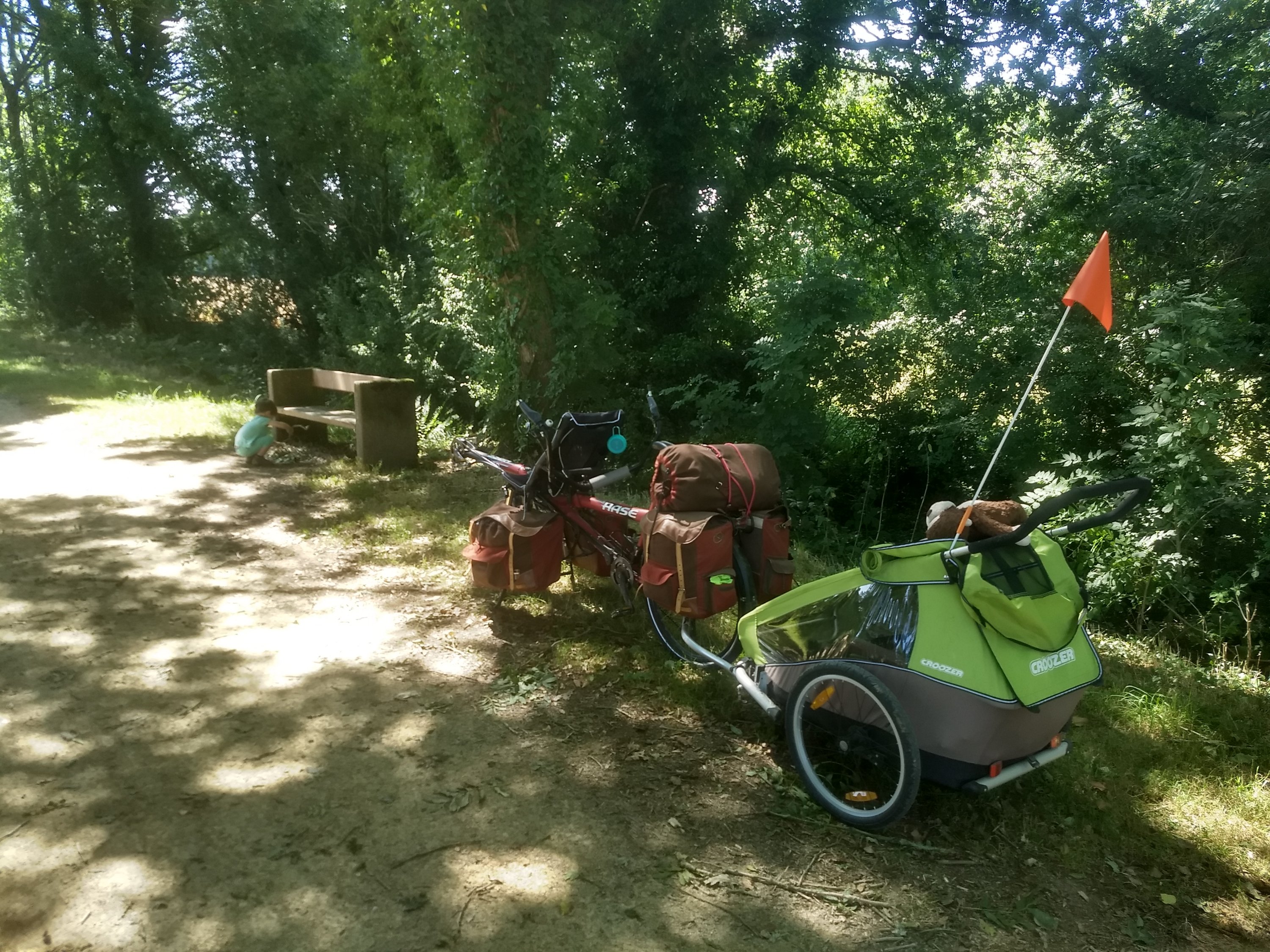 Pause du midi peu avant la rigole Le bémol est à chercher du côté du revêtement. Il est très inégal, et même parfaitement pourri entre les kilomètres 20 et 25 environ. On doit rouler quasi au pas pour ne pas secouer les enfants dans la charette sur ce troncon. On rigole moyen. Des vélos couchés nous raconterons le soir avoir vécus la même galère.