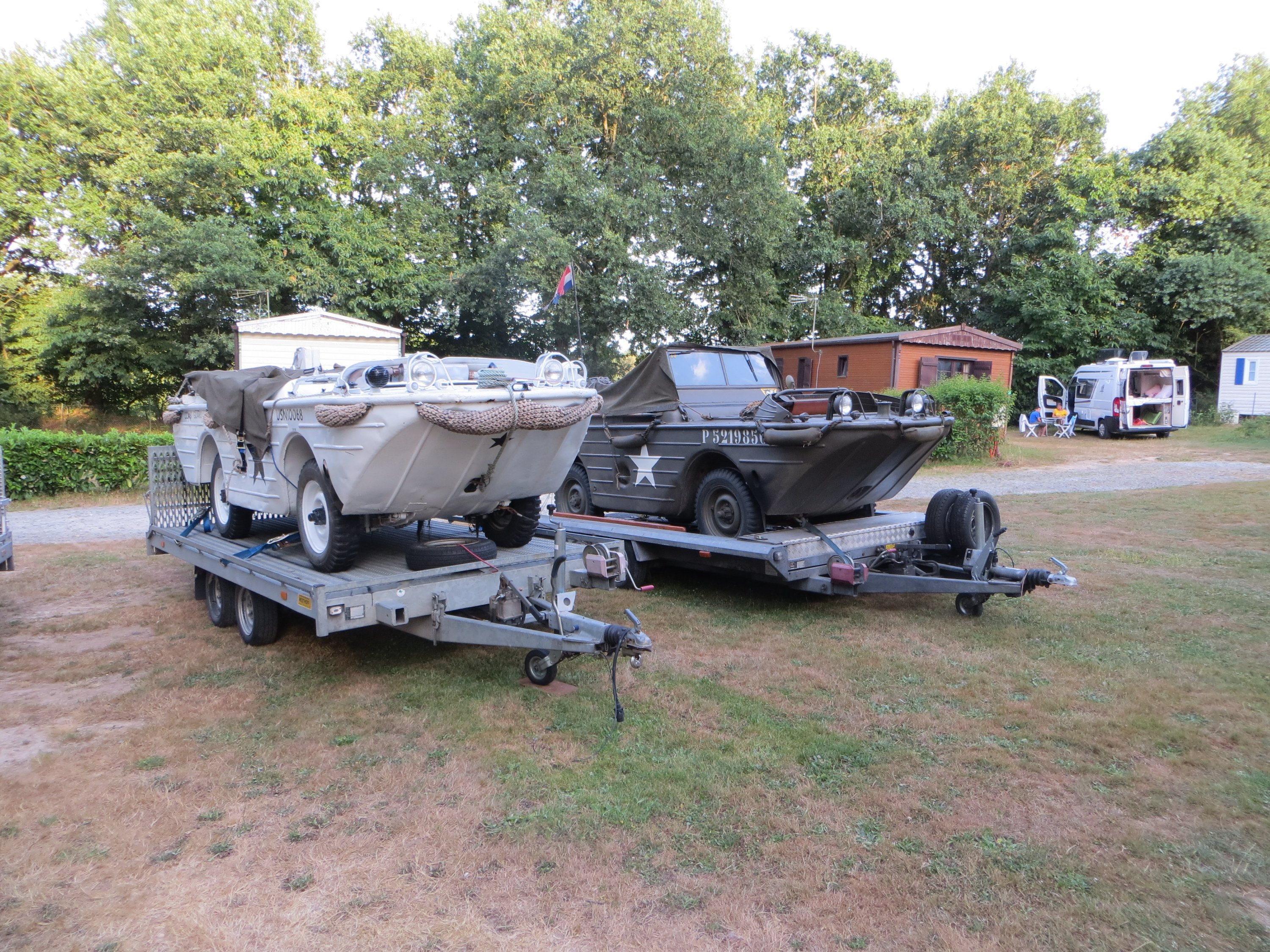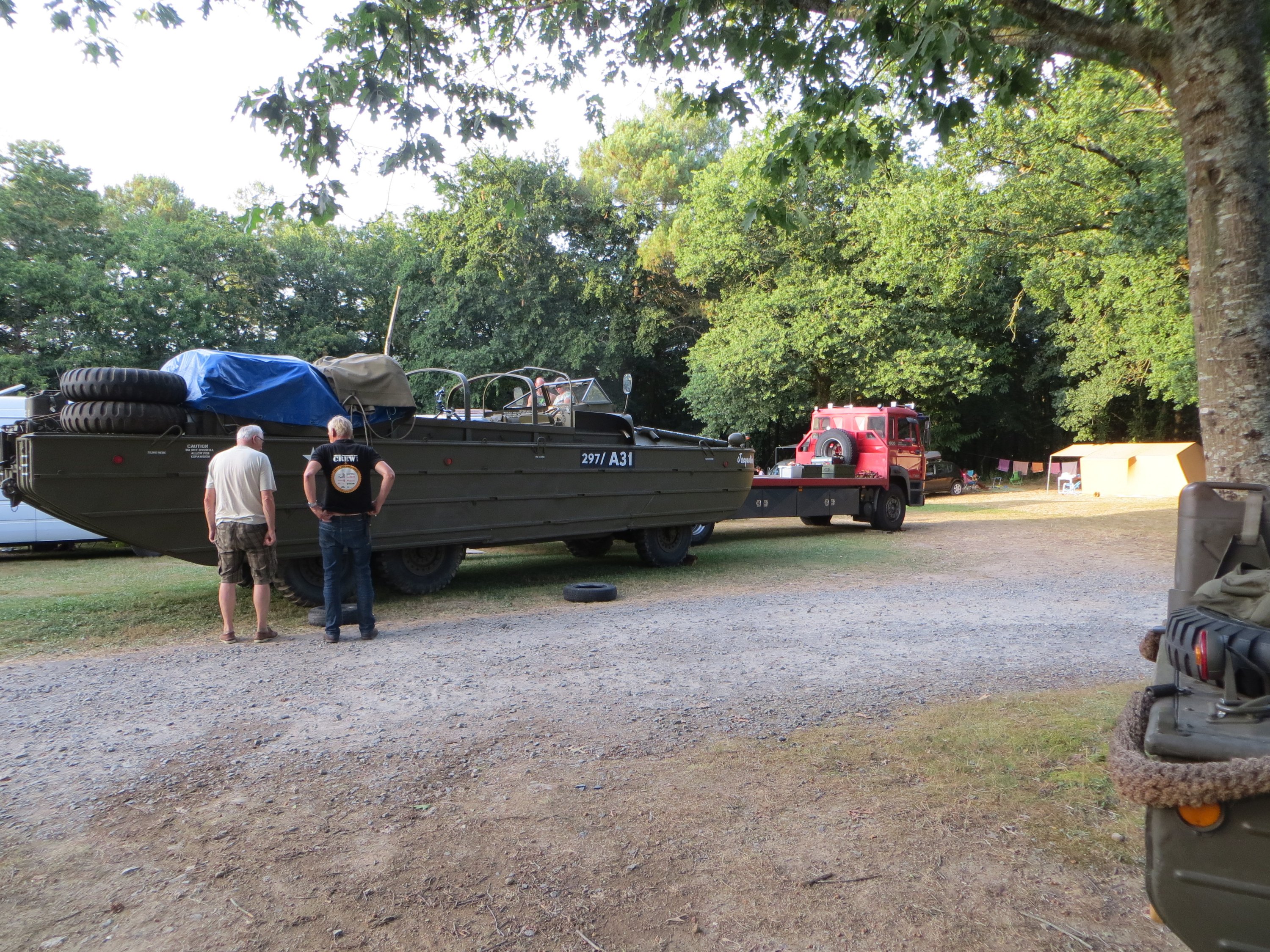 Lui aussi a bien bossé, il est monté à pieds Ce camping a un super équipement pour les cyclistes. Tout d’abord les livraisons de viennoiseries, garanties avant 7h30 (contre 9h à Nort sur Erdre, par exemple). Ensuite une petite cuisine (gazinière, vaisselle, chapiteau…). En prime, une rencontre internationale des véhicules amphibies s’y tient, ça rajoute des trucs à regarder.