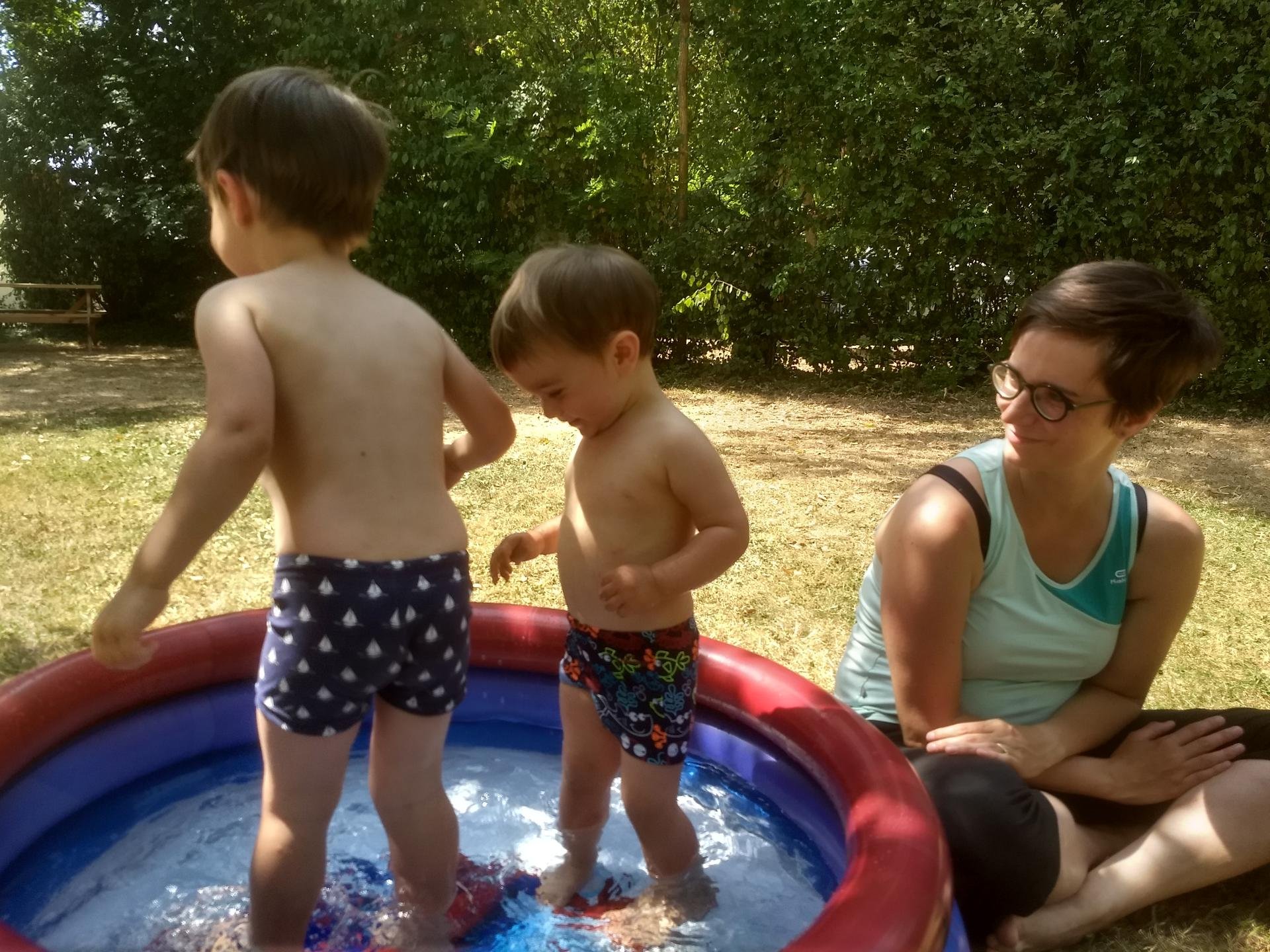 Au camping, les gestionnaires sont très sympa. Après la sieste des enfants, ils prêtent une petite piscine pour rafraîchir les enfants. On atteint environ 40 degrés dans l’après-midi (partir en Bretagne pour être au frais…)