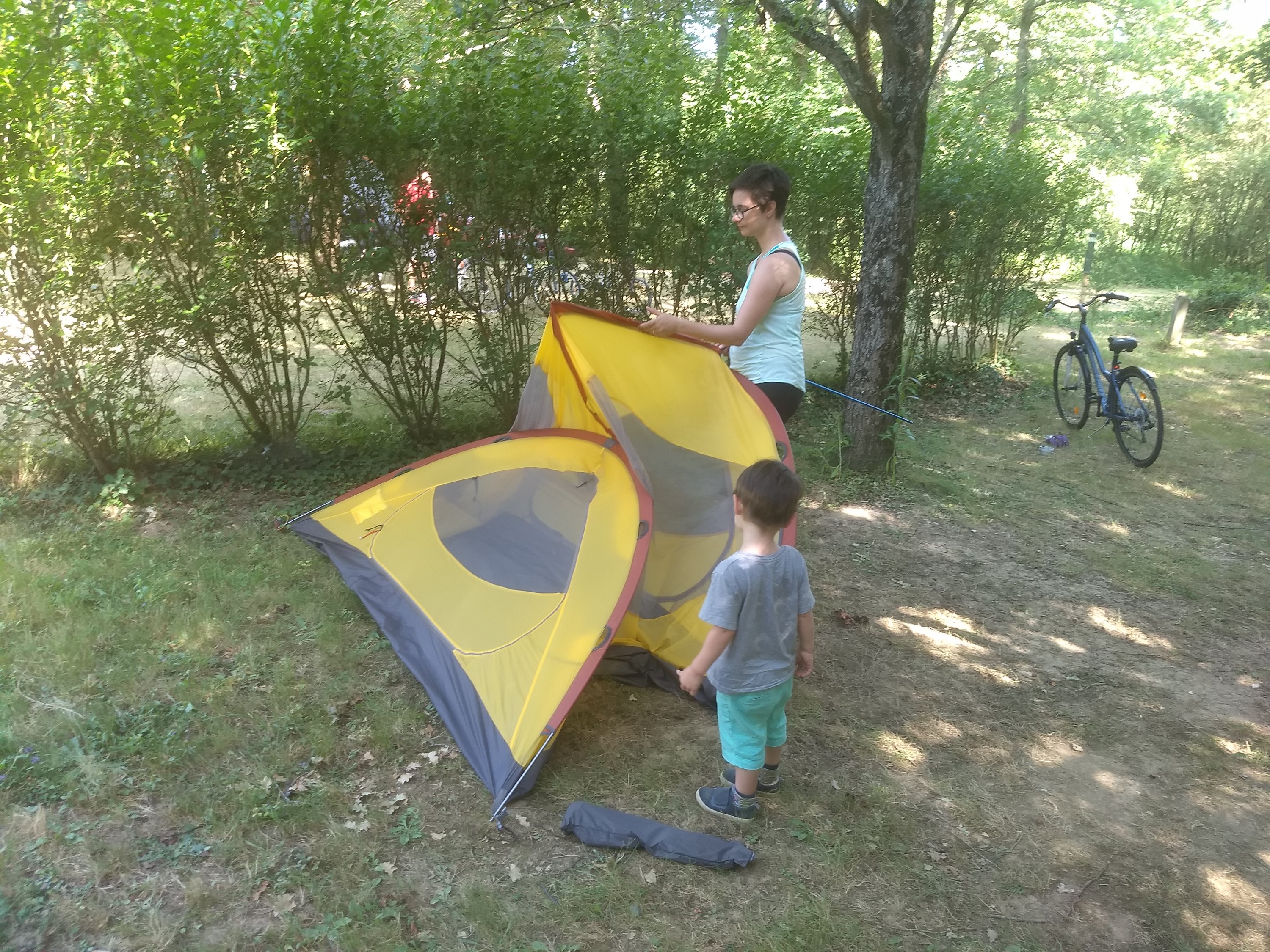 On s’est donc retrouvé le samedi, cueillis à la gare, en allant directement ensuite à Nort sur Erdre pour éviter la zone urbaine de Nantes. On est resté ensemble jusqu’au lundi matin. On a ainsi pu tester un peu le matériel (notamment vérifier que tout rentre dans les sacoches…), habituer les enfants au camping (la première nuit c’était quelque chose…), et faire une petite promenade de 23 kilomètres sans trop de matériel le dimanche (ça tombe bien, les montées sur les croisements entre le canal et les ponts sont violentes dans le coin !).
