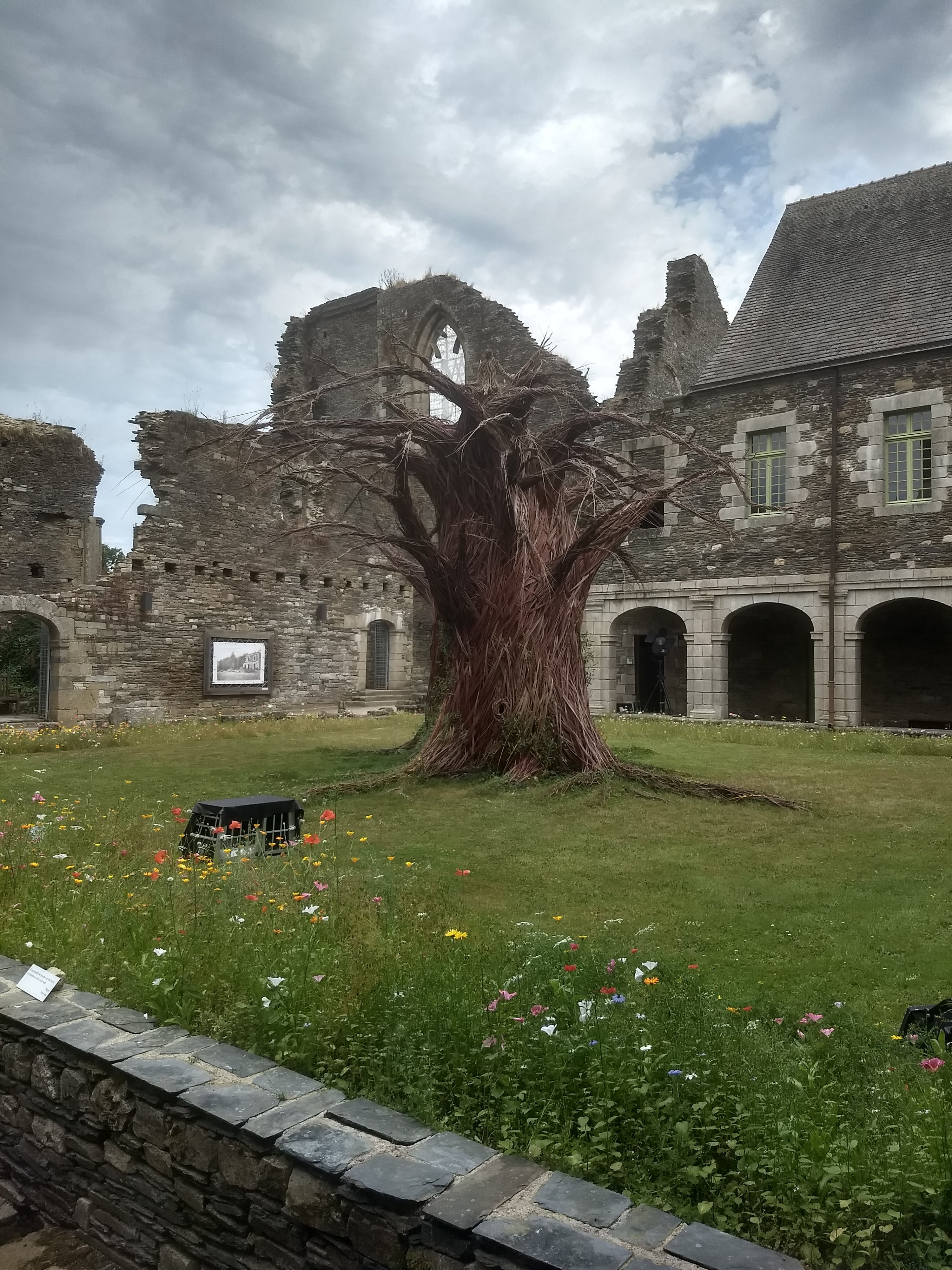 Ensuite par contre c’est super. Les anciennes voies ferrés sont vraiment très agréables : moins monotones que les canaux, mais toujours à faible dénivelé compatible avec notre lourd chargement. On a plus de paysage, et on croise aussi quelques villages sympathiques. On déjeune d’ailleurs à Maël-Carhaix, une bourgade “tout services”.