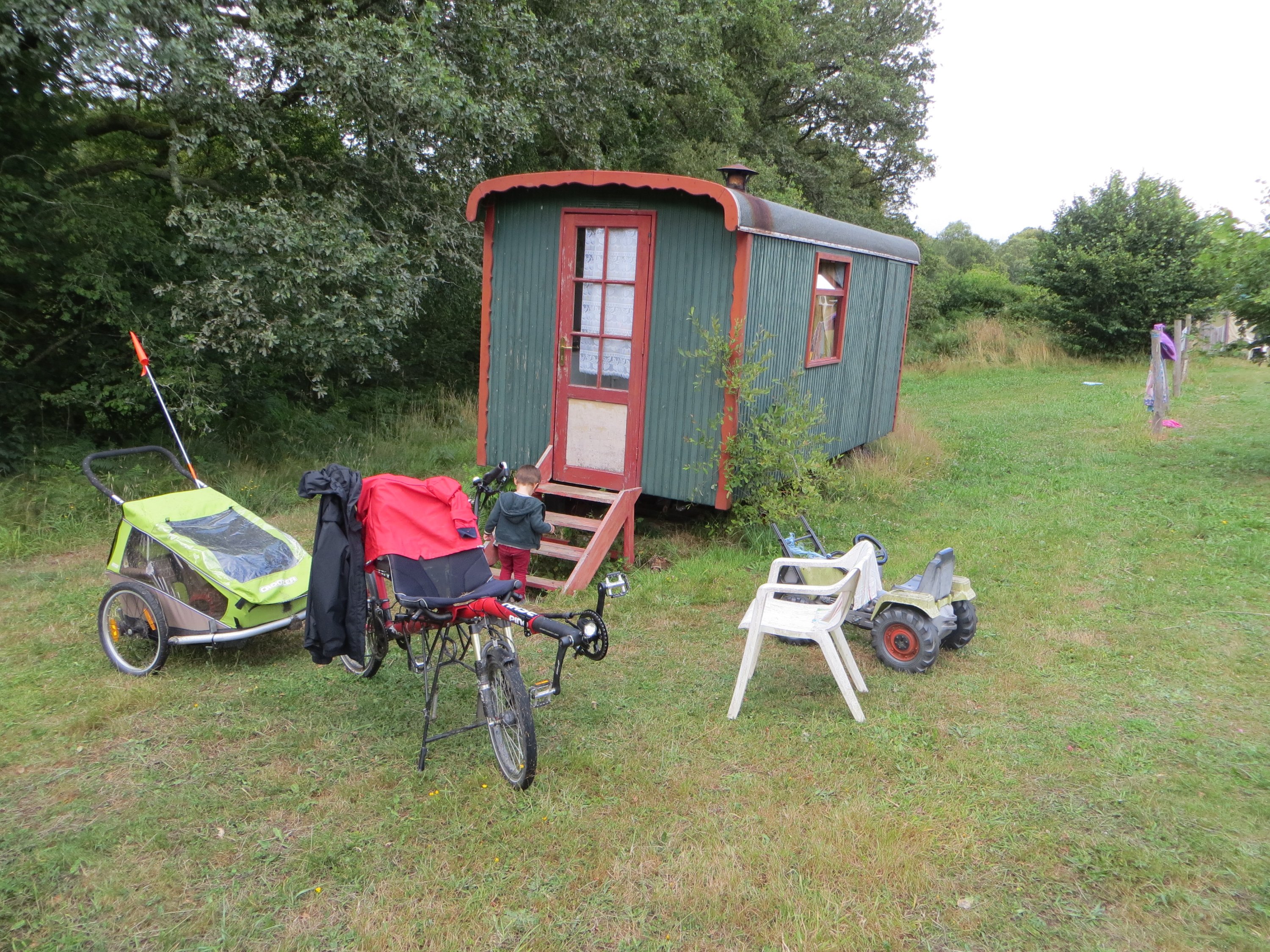 Après une énorme averse juste avant, on monte à Mur de Bretagne difficilement. Concrètement Colin monte à pieds avec Juliette, pendant que je fais par petits sprints monter le vélo et Oscar. On arrive assez tôt au camping, et une éclaircie nous permet de bien tout attacher en prévision des vents forts de la nuit.