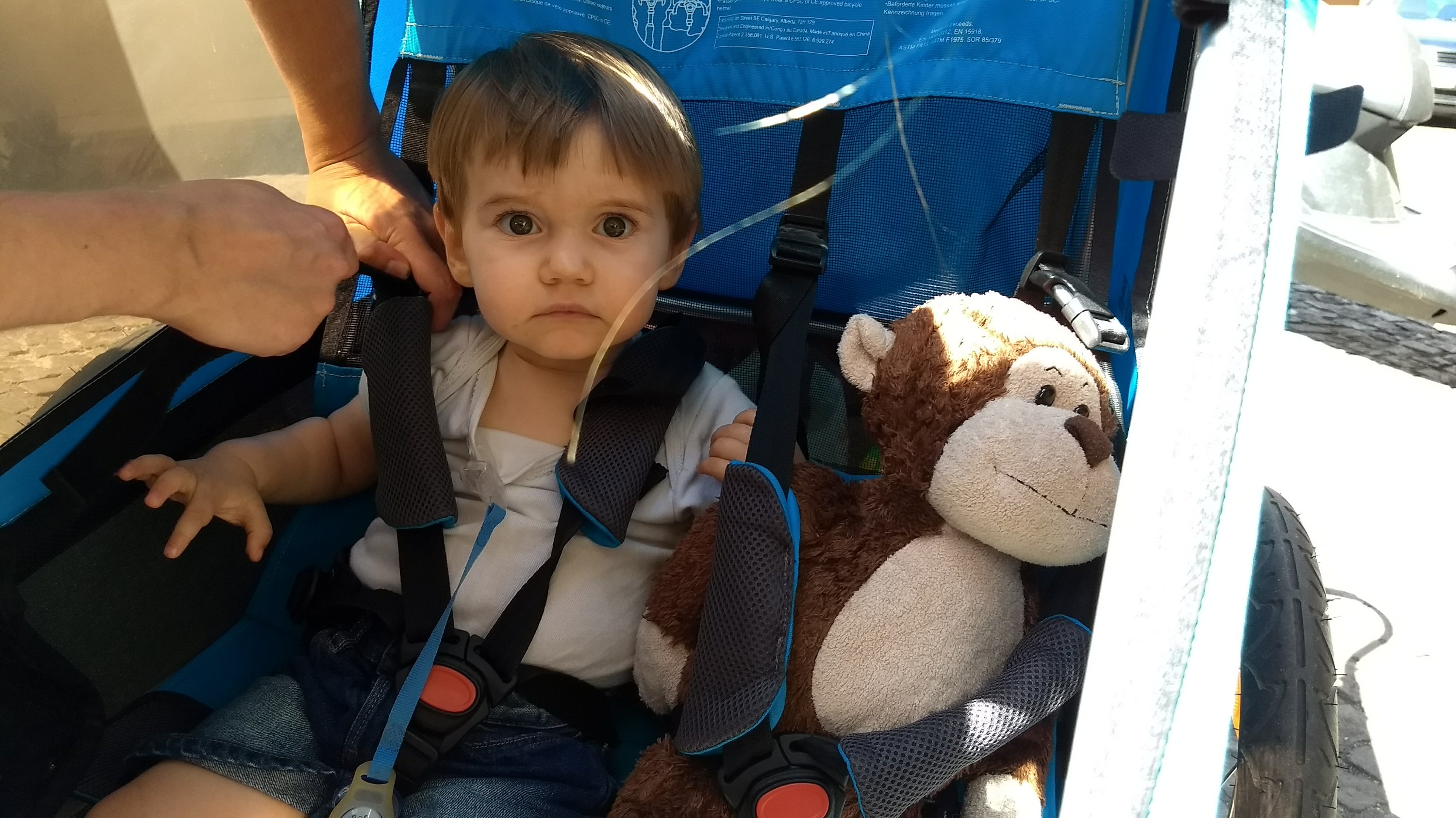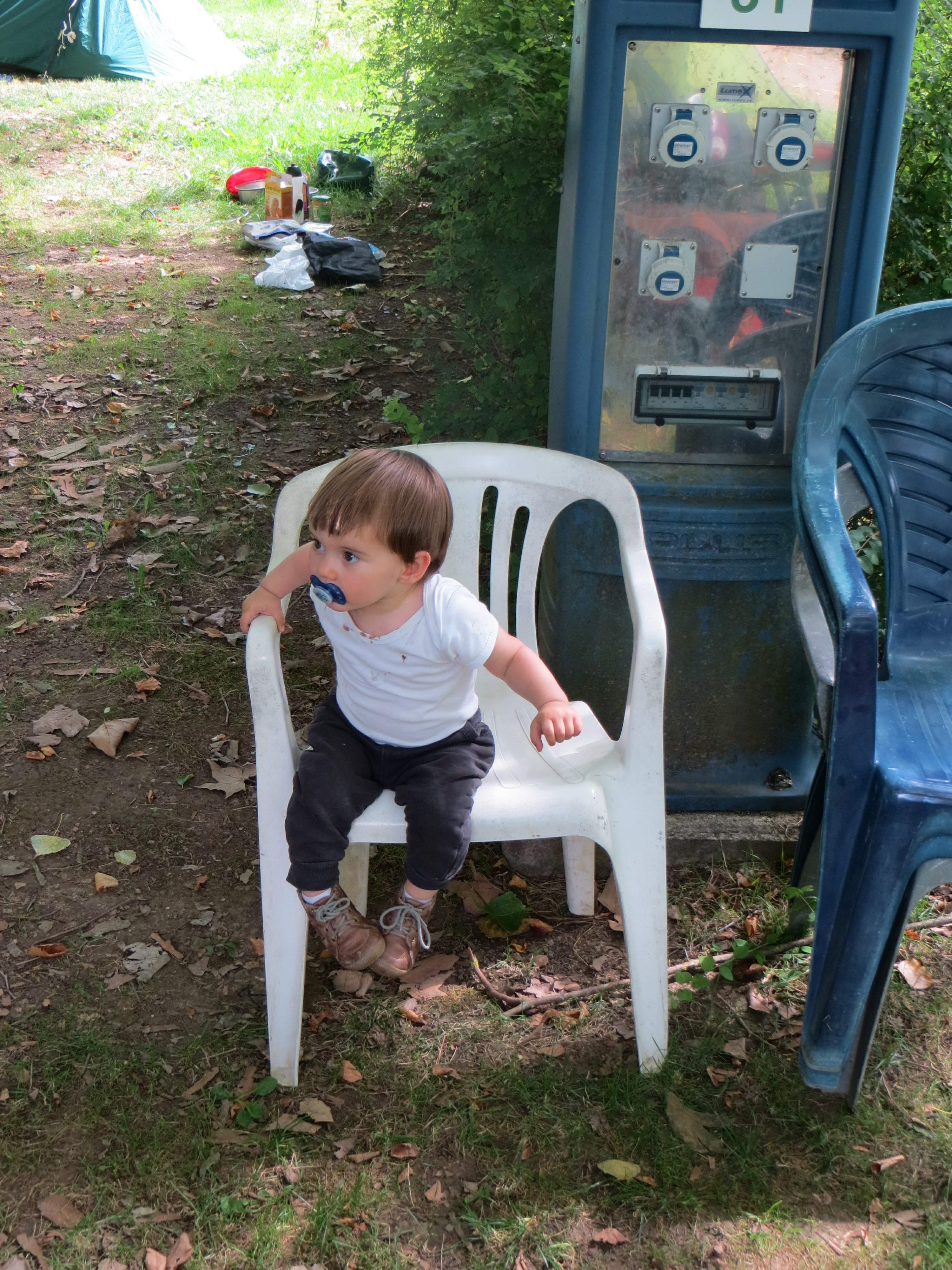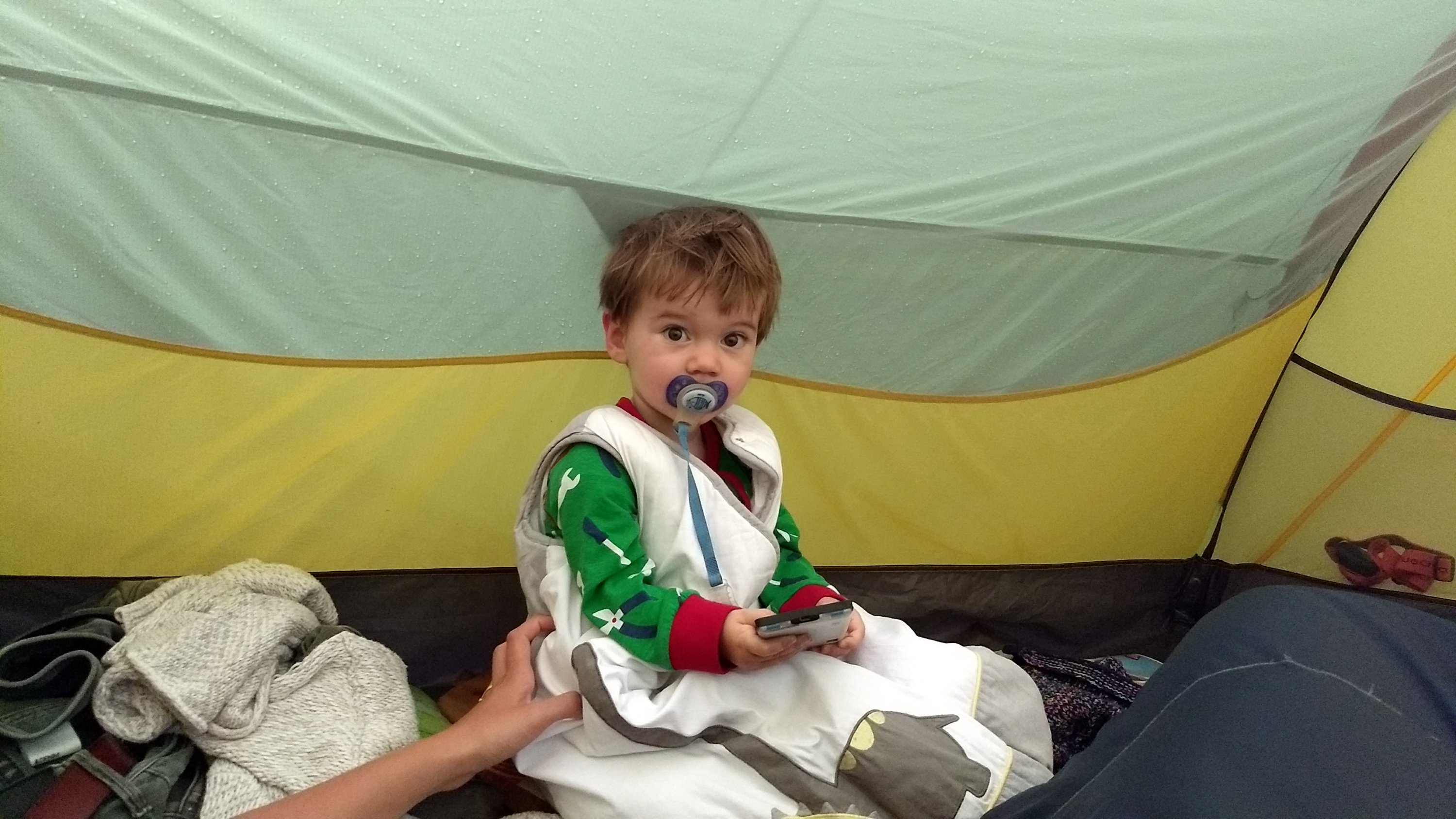 Le mauvais temps nous rattrape et la pluie tombe en trombes pendant la nuit et encore le matin. Nous apprécions d’avoir au moins doublé voire triplé la surface au sol par rapport à notre précédente tente, mais cela reste exiguë pour tenir plusieurs heures dessous. En tout cas, cela ne gêne pas le moins du monde Colin qui profite de cette matinée pour faire une sieste digne de ce nom (pas balloté par monts et vaux par ses parents).
