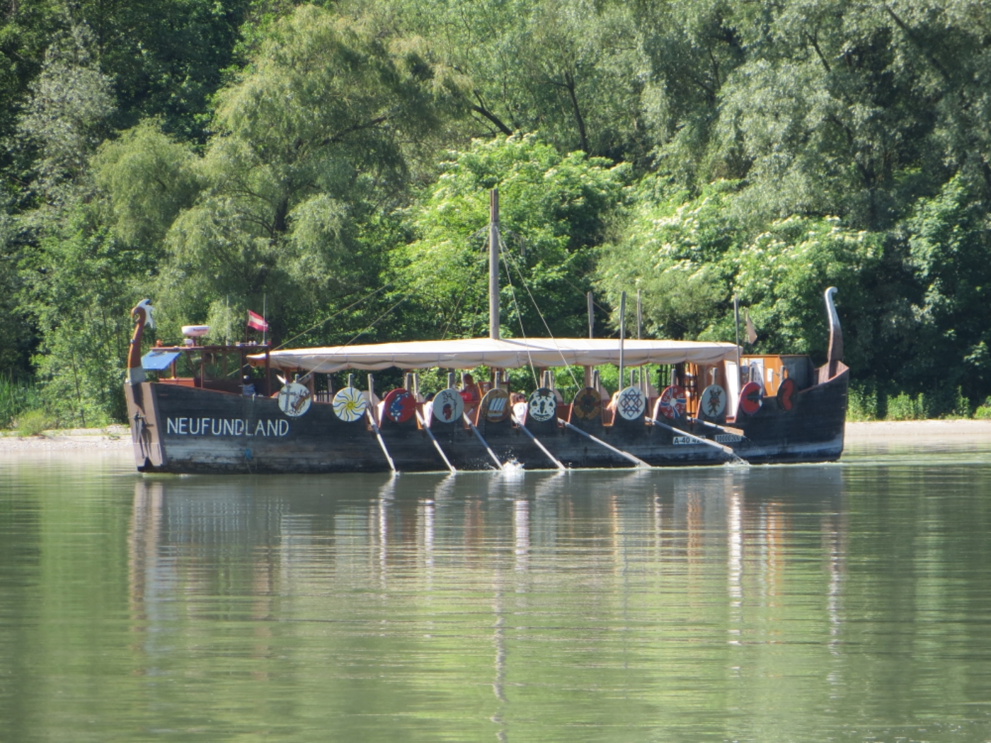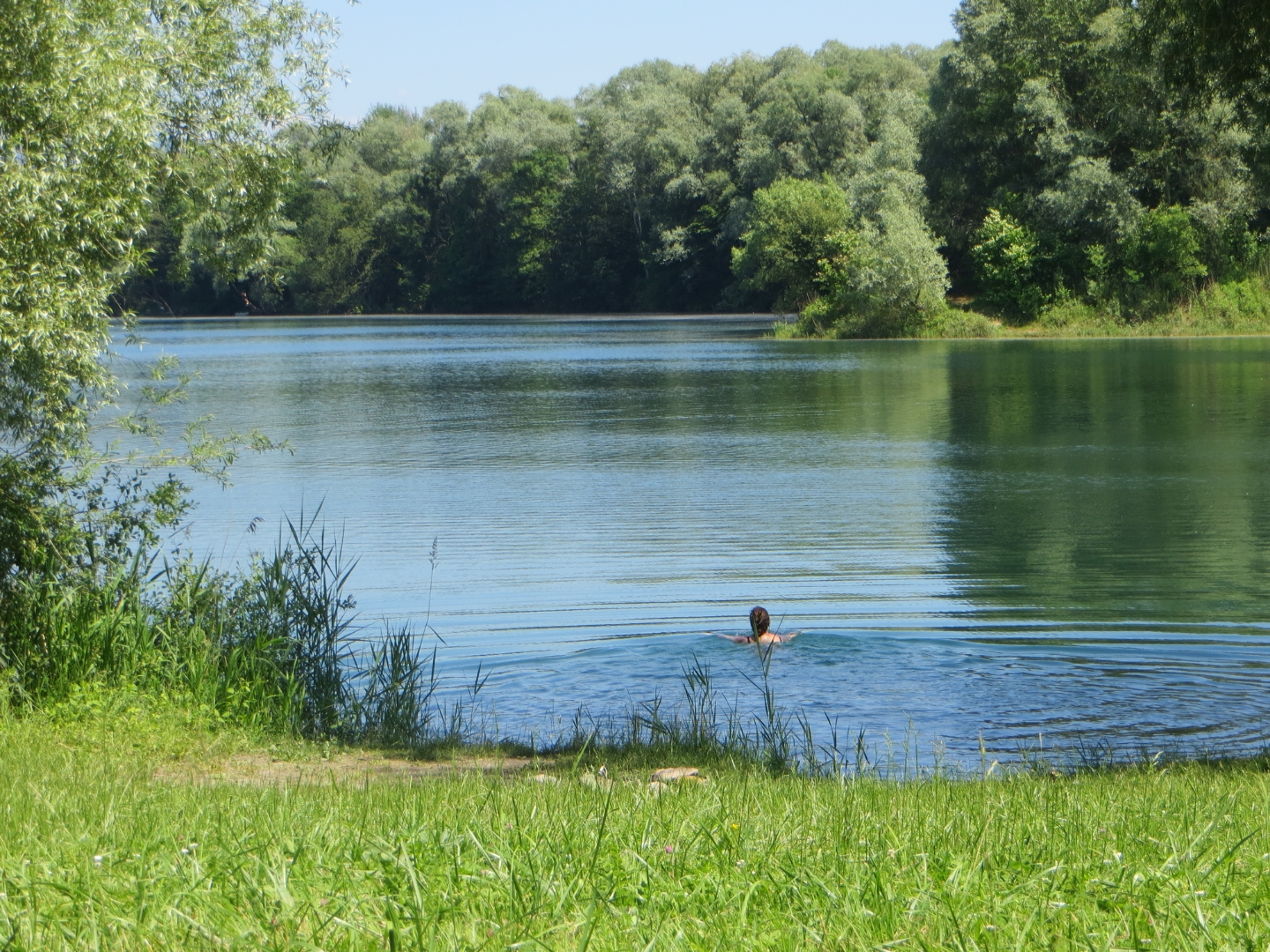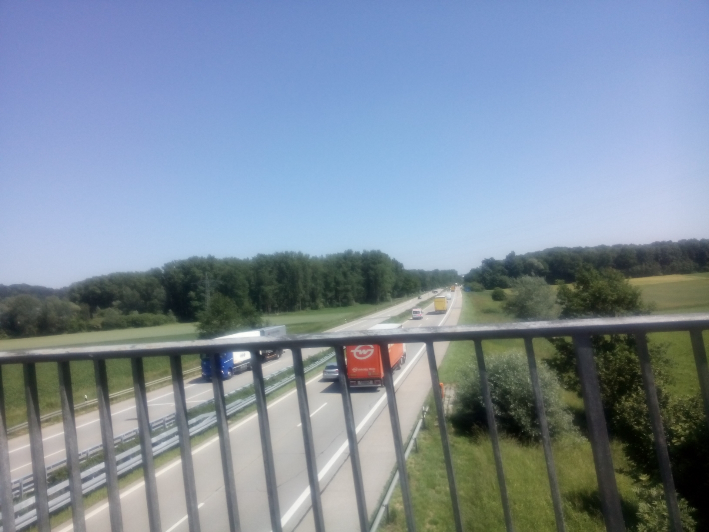 Durant l’après-midi, on fait moins de visites et on fait surtout du pédalage efficace. On avait choisi de rester sur la rive nord du Danube, très peu peuplée à cet endroit mais dont le trajet cyclable est beaucoup plus plat. Les collines que nous voyons depuis notre rive confirment que c’était une bonne idée ! Le plan était vraiment très peu engageant, surtout vu la durée de l’étape. De notre côté, ça roule bien, au vert et toujours avec la même température un peu fraîche. On traverse ensuite une forêt. Puis un peu de civilisation. Puis on arrive (enfin ?) dans la banlieue de Ulm. On cherche un café, sans grand succès jusqu’à Thalfingen, soit à 8 kilomètres de l’objectif environ.