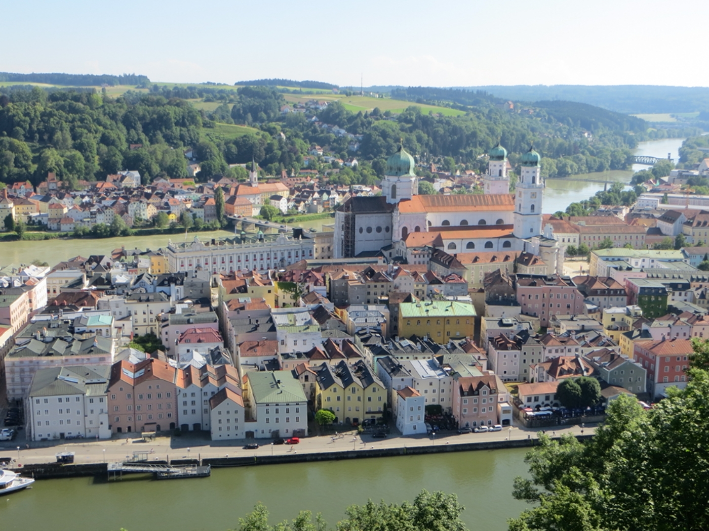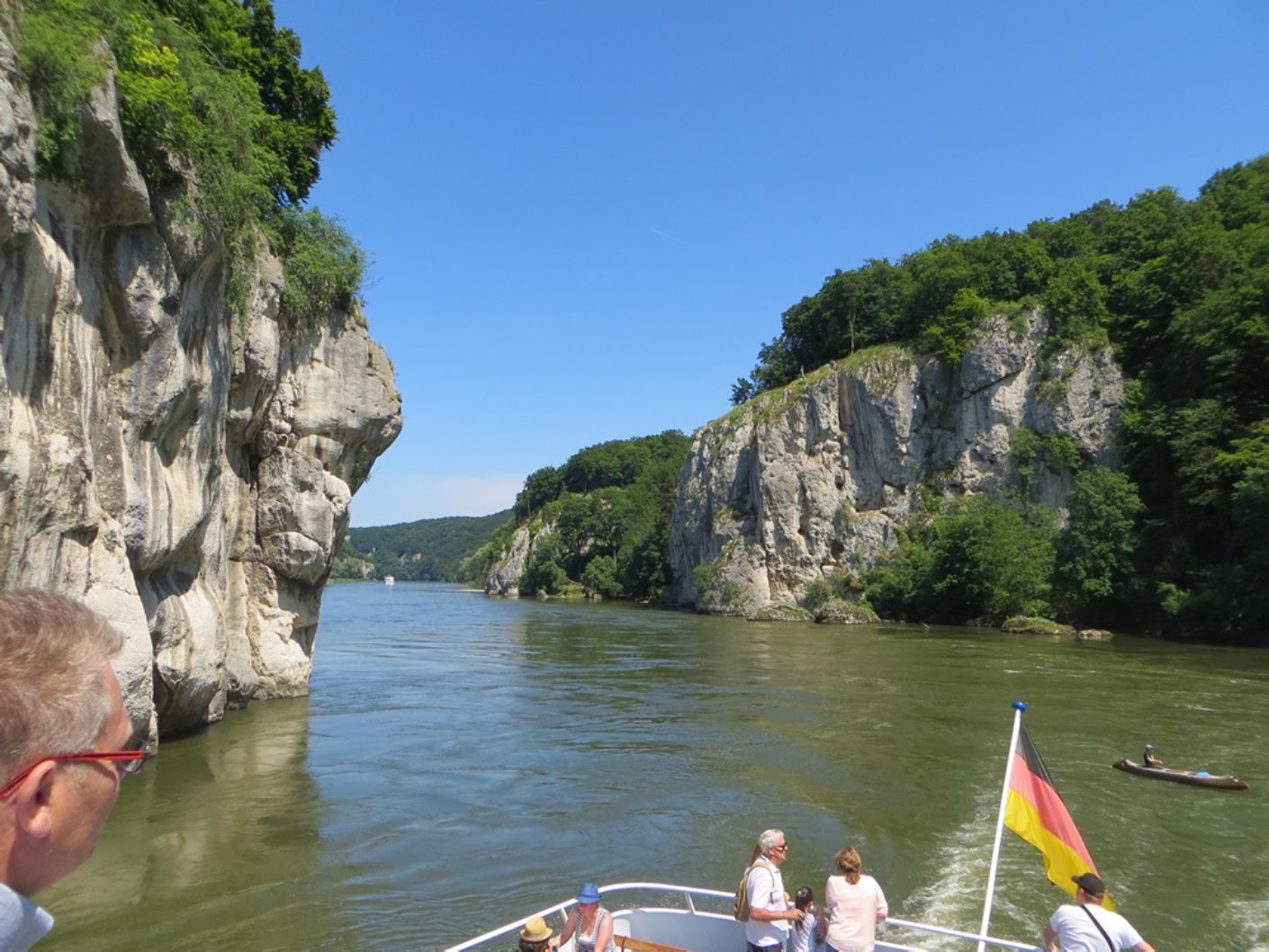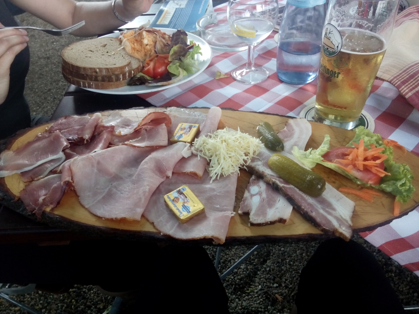 Durant l’après-midi, on fait moins de visites et on fait surtout du pédalage efficace. On avait choisi de rester sur la rive nord du Danube, très peu peuplée à cet endroit mais dont le trajet cyclable est beaucoup plus plat. Les collines que nous voyons depuis notre rive confirment que c’était une bonne idée ! Le plan était vraiment très peu engageant, surtout vu la durée de l’étape. De notre côté, ça roule bien, au vert et toujours avec la même température un peu fraîche. On traverse ensuite une forêt. Puis un peu de civilisation. Puis on arrive (enfin ?) dans la banlieue de Ulm. On cherche un café, sans grand succès jusqu’à Thalfingen, soit à 8 kilomètres de l’objectif environ.